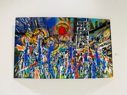 The paintings range in size and mood; some offering quiet moments of reflection, others offering exploding sounds and cityscapes.